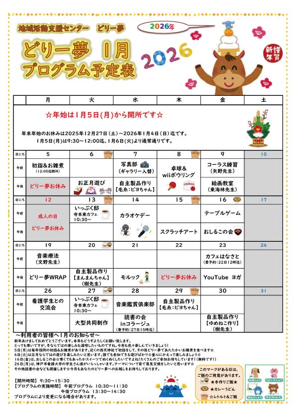 今月もいろいろなプログラムを用意しています。ぜひ、どりー夢で一緒に楽しみましょう。