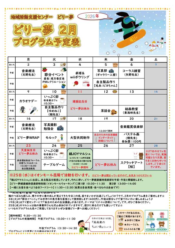 今月もいろいろなプログラムを用意しています。ぜひ、どりー夢で一緒に楽しみましょう。