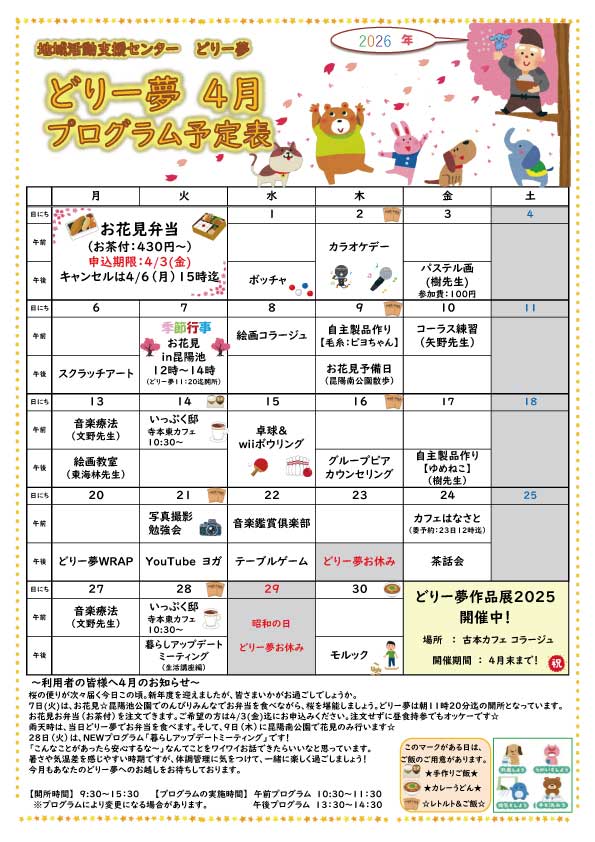 今月もいろいろなプログラムを用意しています。ぜひ、どりー夢で一緒に楽しみましょう。