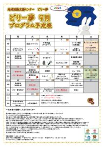 少しづつ涼しくなりつつある今日この頃、皆さまいかがお過ごしでしょうか? 夏の終わりと共に秋の気配を感じてきましたね。寒暖差で疲れがでてくる頃です。くれぐれも体調に気を付けてくださいね。 今月もいろいろなプログラムを用意し […]